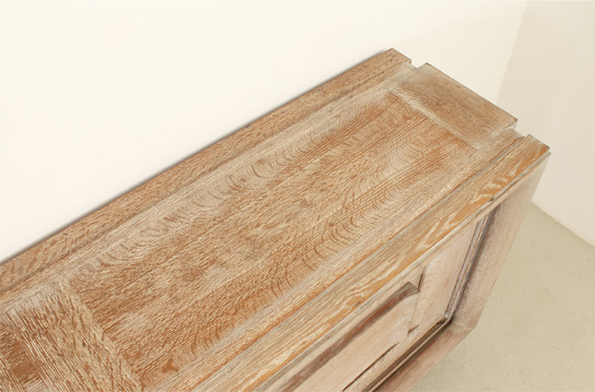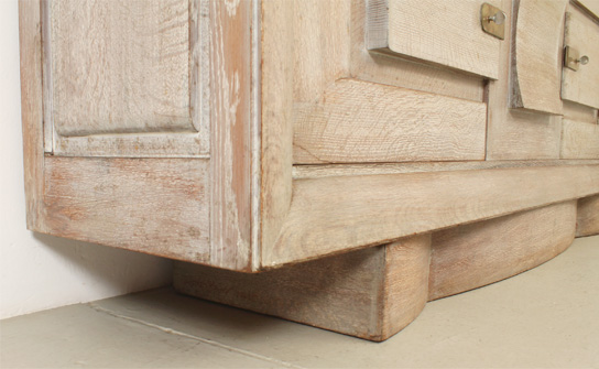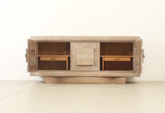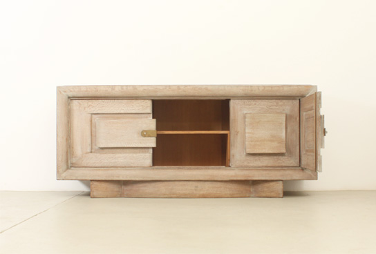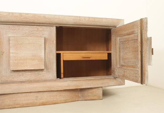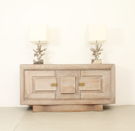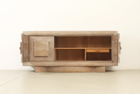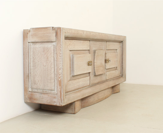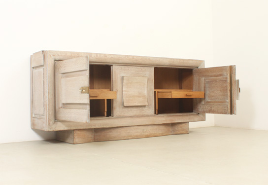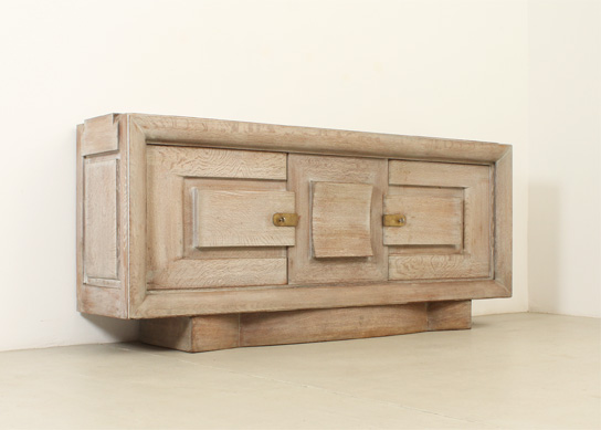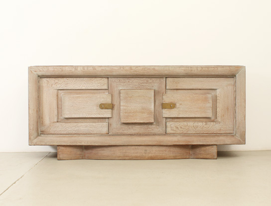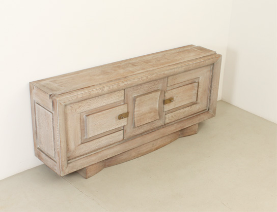 FRENCH ART DECO SIDEBOARD IN THE STYLE OF CHARLES DUDOUYT, 1940's | French Art Deco sideboard in the style of Charles Dudouyt, 1940's. Solid cerused oak wood and brass fittings. Three compartments with internal shelves and two drawers, the central front piece can be moved to either side. Very good condition.