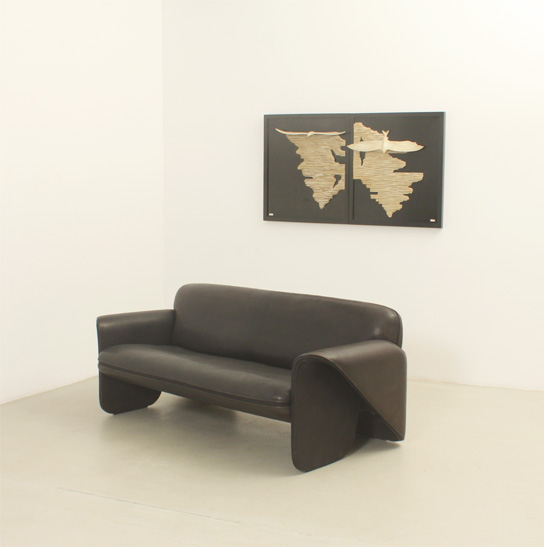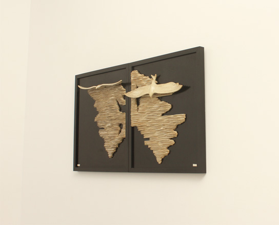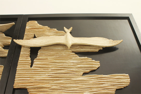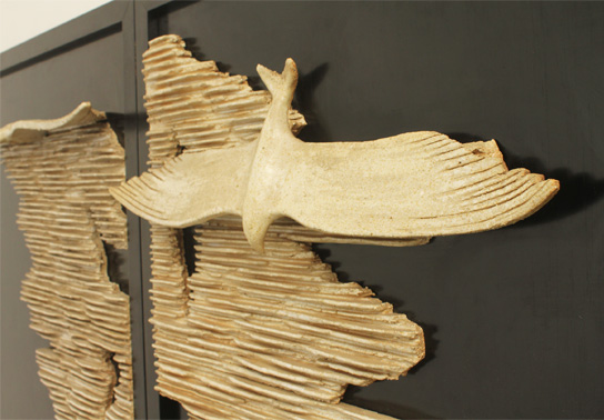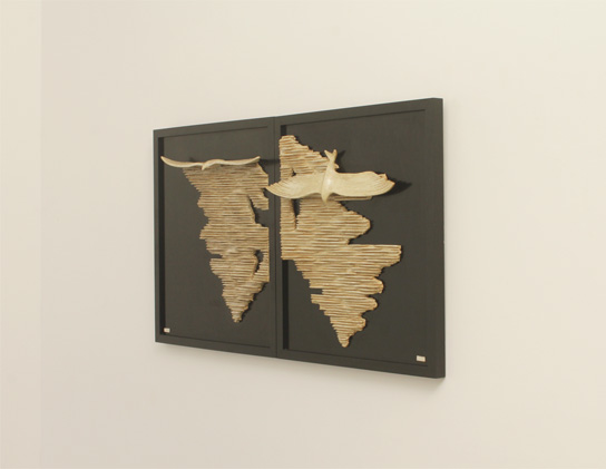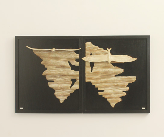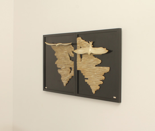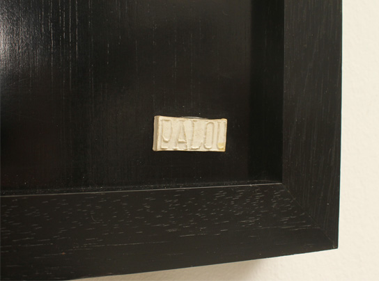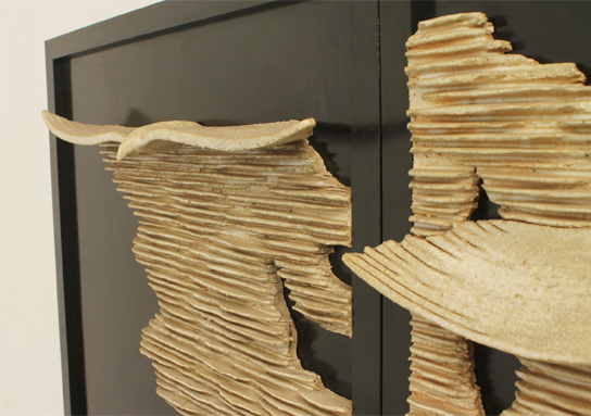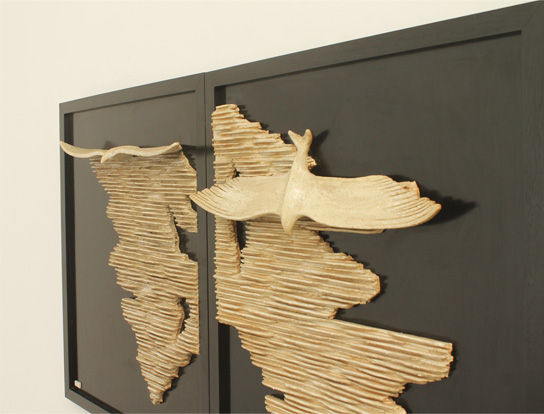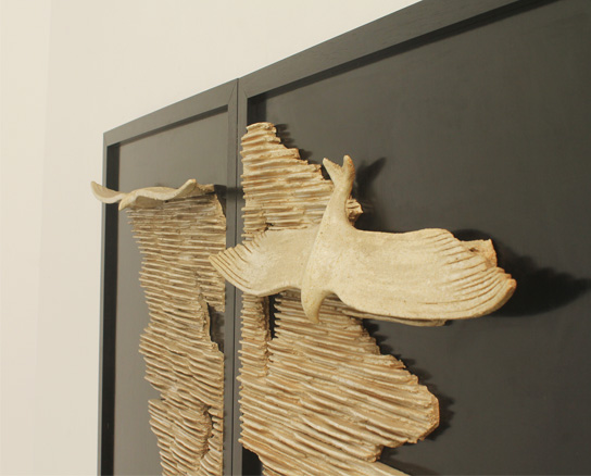 Pareja de cuadros con relieves cerámicos de Josep Maria Palou, España, de los años 1980's. Marcos de madera de roble ebonizado negro con relieve cerámico. Muy buen estado.