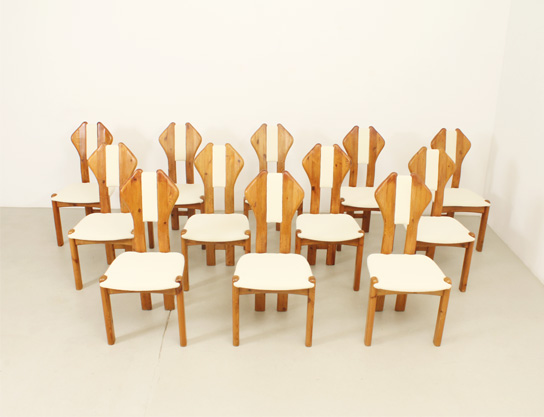 Juego de doce sillas de comedor brutalistas de Holger Danske, Dinamarca, década de 1970's. Madera maciza de pino con tapizado nuevo en tejido bouclé. Muy buen estado, la madera ha sido restaurada.
