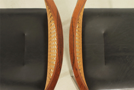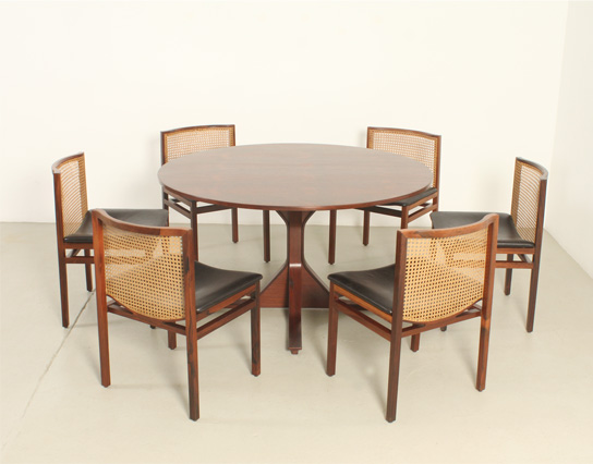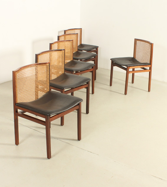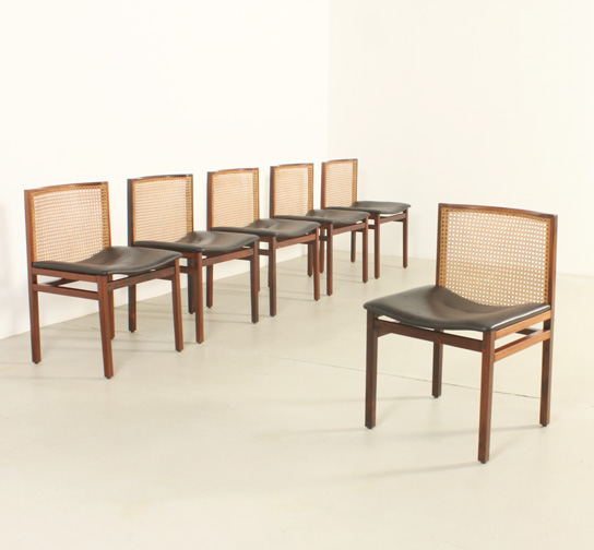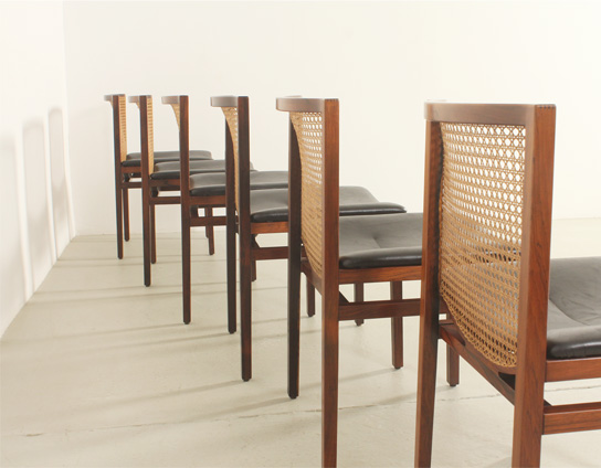 SET OF SIX CHAIRS BY TITO AGNOLI FOR LA LINEA, ITALY, 1957 | Set of six chairs designed in 1957 by Tito Agnoli for La Linea, Italy. Solid rosewood structure with cane backrest and seats upholstered with new black leather. Very good condition.