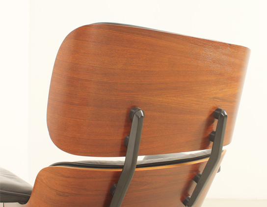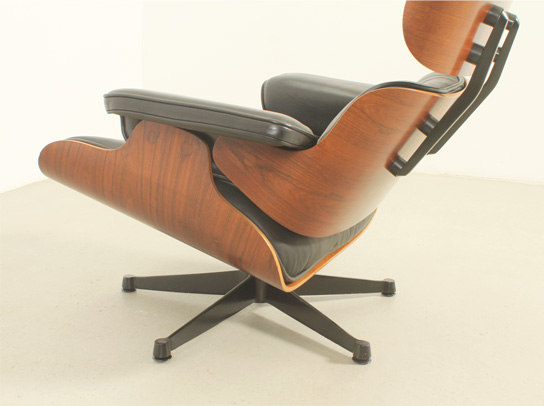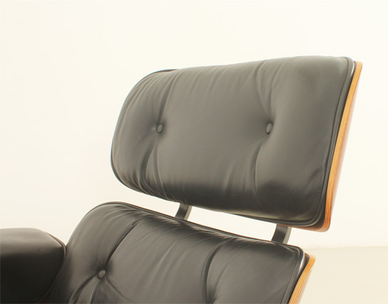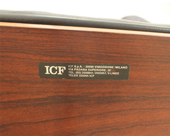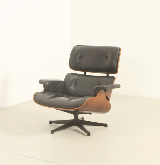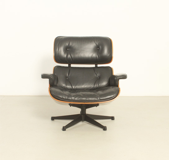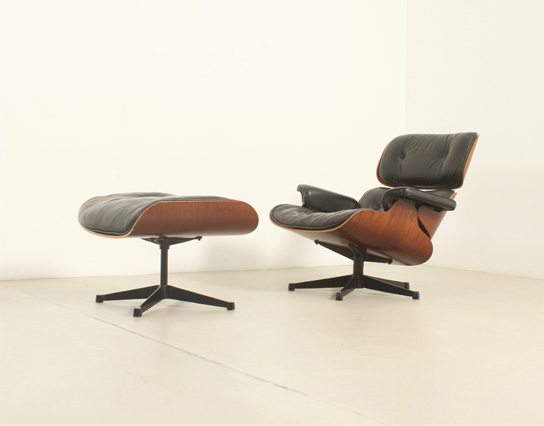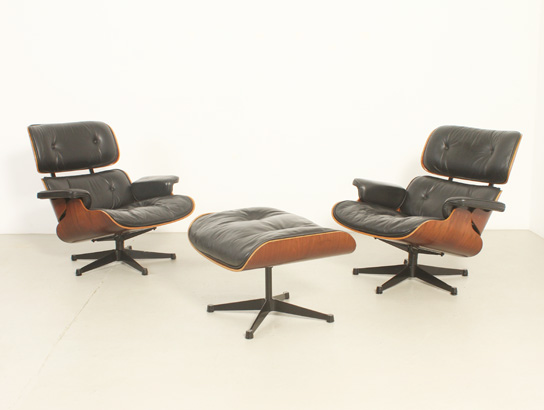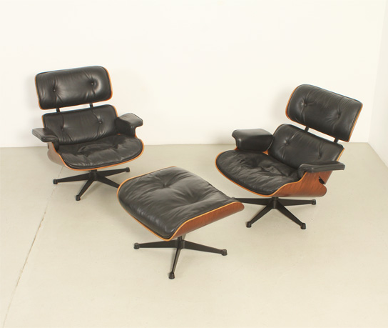 Pareja de sillones lounge y reposapiés diseñados en 1956 por Charles y Ray Eames, editados por ICF, Italia, en la década de 1970's. Contrachapado de palisandro y metal esmaltado en negro con cojines en cuero negro original. Firmados con la etiqueta de ICF. Muy buen estado.