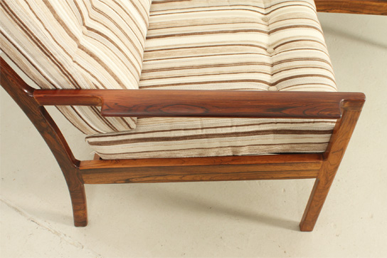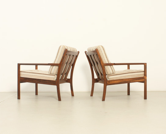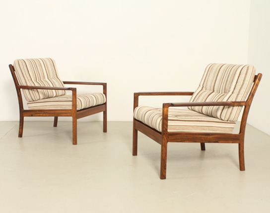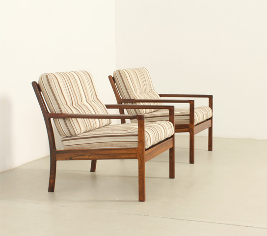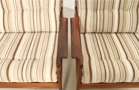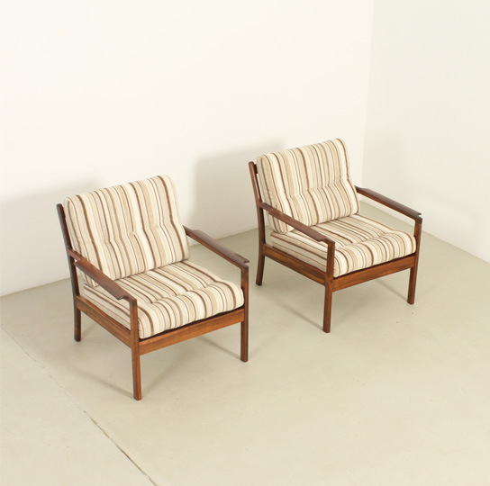 Pareja de sillones daneses de palisandro de los aƱos 1960's. Estructura de palisandro y tapizado en tela original. Trabajo artesanal con madera con una rica veta. Muy buen estado, la madera ha sido restaurada.