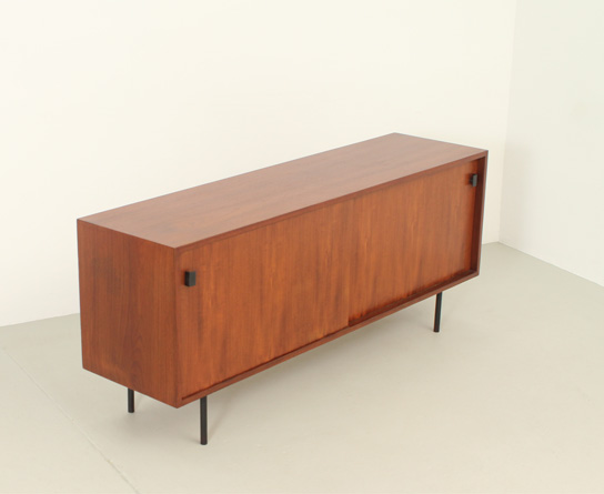 Aparador de mediados de siglo de los años 1950's, probablemente de diseño alemán o danés. Diseño minimalista con dos pequeños tiradores y dos puertas correderas en madera de teca y base en metal lacado en negro. Estado excelente, la madera ha sido restaurada.