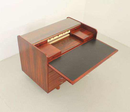 GIANFRANCO FRATTINI 804 DESK FOR BERNINI, ITALY, 1961 | Rosewood writing desk model 804 designed in 1961 by Gianfranco Frattini for Bernini, Italy. Tambour top that hides small drawers and a pull out leather writing surface. Front side with ten drawers and four open spaces on back side. Very good condition, the wood has been refinished.