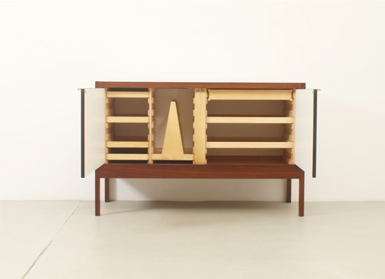 REVERSIBLE SIDEBOARD BY DIETER WÄECKERLIN FOR IDEALHEIM, SWITZERLAND | Reversible sideboard designed in 1963 by Dieter Wäeckerlin for Swiss company Idealheim. Rosewood frame with white laminate and birch wood interior. Rare model from the Series 3 with doors on both sides, extra quality details and multiple storage capacity, specially designed to store the tableware. Very good condition with minimal used marks.