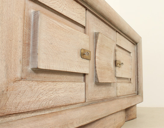 FRENCH ART DECO SIDEBOARD IN THE STYLE OF CHARLES DUDOUYT, 1940's | French Art Deco sideboard in the style of Charles Dudouyt, 1940's. Solid cerused oak wood and brass fittings. Three compartments with internal shelves and two drawers, the central front piece can be moved to either side. Very good condition.