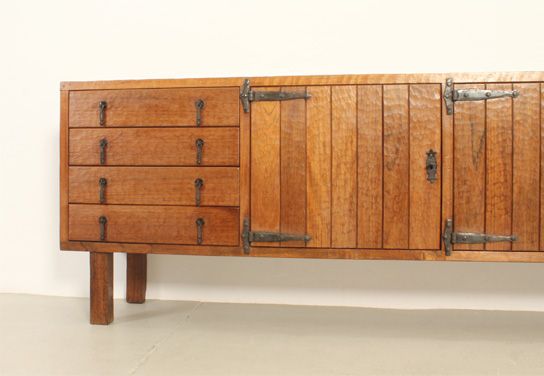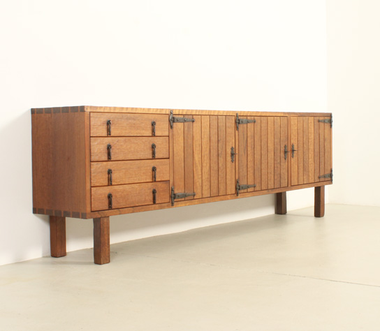 LARGE BRUTALIST SIDEBOARD WITH DECOR À LA GOUGE IN THE STYLE OF JEAN TOURET, FRANCE | Large brutalist sideboard with decor à la gouge in the style of Jean Touret from 1950's, France. Solid walnut wood with à la gouge decoration and very detailed joints, wrought iron fittings. See our other matching smaller sideboard. Very good condition, the wood has been refinished.