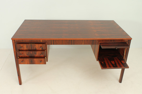 Escritorio en palisandro de Rio diseñado en los años 1960's por Erik Wørts, Dinamarca. Tres cajones, puerta abatible y extensión en el lado frontal y dos compartimentos con estantería en el lado posterior. Estado excelente.