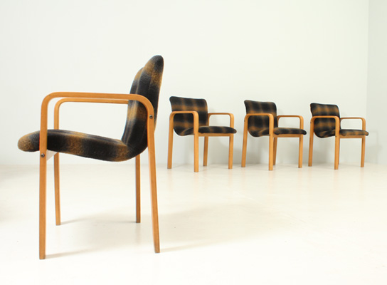 A set of four dining chairs with arms from 1950's in the manner of Alvar Aalto works. Plywood birch frame and original upholstered seats. Very good condition.