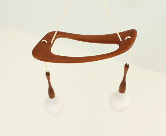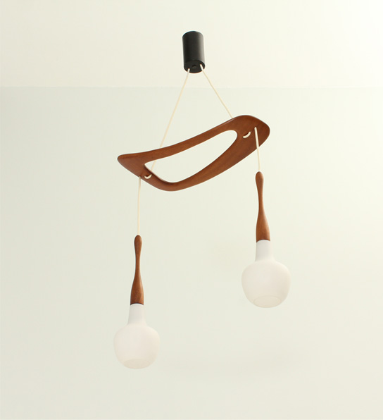 Lámpara de techo doble diseñada en los años 1950's por Jean Rispal para Rispal, Francia. Madera de teca y cristal opal, la altura puede ser regulada por el cable. Estado excelente.