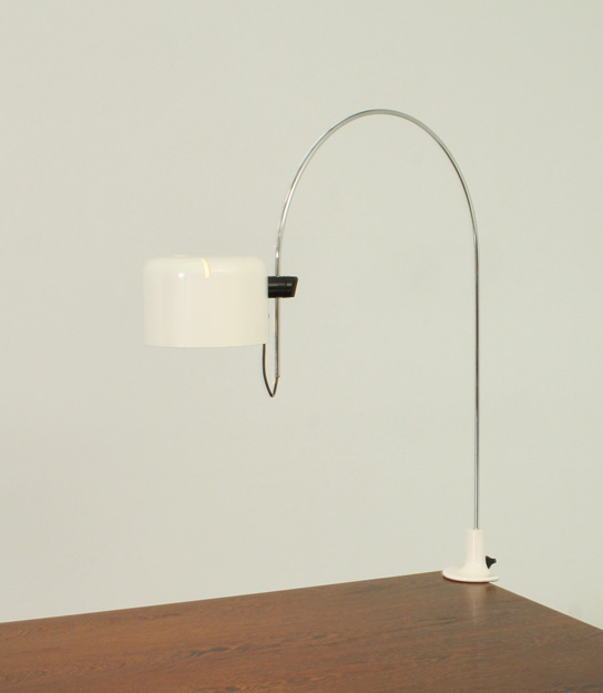Lámpara de mesa Coupé diseñada por Joe Colombo en 1967 para Oluce, Italia. Metal lacado en blanco y cromo. Regulable en altura con brazo y pantalla giratorios. Muy buen estado.