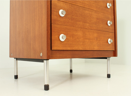 Cajonera diseñada en los años 1960's por George Coslin como parte de la colección de muebles para 3V Arredamenti, Italia. Cinco cajones en madera de teca en dos tonos, tiradores muy gráficos en aluminio y laminado blanco y bases en aluminio con terminación regulable en metal. Estado excelente.