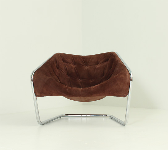 Sillón Boxer diseñado en 1970 por el arquitecto hongkonés Kwok Hoï Chan para Steiner, Francia. Estructura en acero cromado con asiento moldeado tapizado con ante original. Muy buen estado con mínimas marcas del tiempo.
