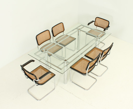 SET OF SIX CESCA CHAIRS BY MARCEL BREUER, ITALY, 1970's | Set of four Cesca side chairs and two arm chairs from 1970's, originally designed by Marcel Breuer in 1928, they are an italian edition from 1970's. Chromed plated metal structure with seat and back in lacquered wood and woven cane. Very good condition.