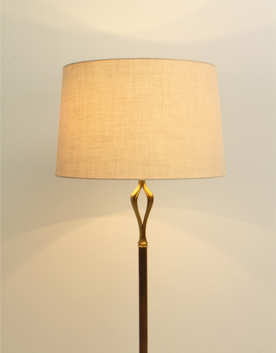 Lámpara de pie diseñada a finales de los años 1940's por la firma española Metalarte. Elegante construcción en latón con sofisticada base en cabriole, pantalla original con tela nueva. Excelente estado. Firmada.