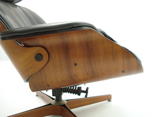 A rare pair of high-back lounge chairs and ottomans designed by George Mulhauser for Plycraft, USA, late 50's. Moulded walnut wood, metal and original black vinyl upholstery. Extremely comfortable with reclining position, swivel base for chair and ottoman.
