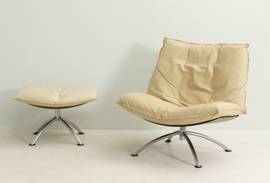 Butaca y reposapiés Prime Time, diseñados por Tom Stepp en 2009 para Fredericia, Dinamarca. Asiento en madera de nogal curvada y bases en acero, recubierto de cojines en piel extraibles. La butaca y el reposapiés son giratorios. Estado excelente.