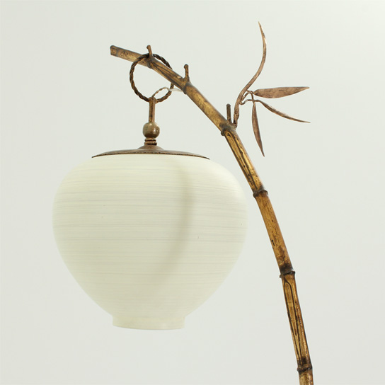 GILT FAUX BAMBOO FLOOR LAMP, SPAIN 1950s | Floor lamp in gilt metal faux bamboo with white opaline reflector with hand painted details. Spain, 1950's. Excellent condition.