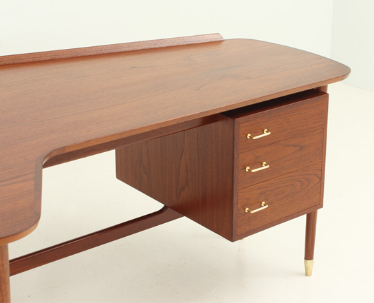 Raro escritorio modelo BO 85 diseñado en 1952 por Arne Vodder para Bovirke, Dinamarca. Madera de teca y roble con elementos en latón. Estado excelente.